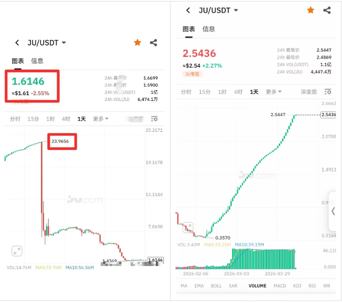 其次是量价关系的严重背离。在2026年2月至4月的拉盘过程中,一个极其反常的现象是,JU币的价格单边上涨,但其每日的成交量却始终诡异地恒定在4300万美元左右。这种“价涨量平”的现象,在真实的金融市场中几乎不可能出现。它唯一能证明的,就是所谓的“成交量”完全是平台自己刷出来的假数据,目的就是为了营造市场繁荣的假象,让投资者误以为有真实的买盘在支撑价格上涨。