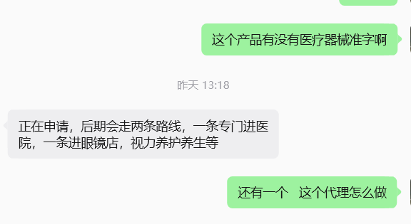 “视保姆”的宣传中提到了可以治疗近视,最终能达到摘镜的效果。这种佩戴式的带有治疗功能的眼镜是必须申请医疗器械准字的,也就是我们经常说的“械字号”。但是小诺找到“视保姆”的销售人员了解到,目前公司正在申请,不久后就会拿到医疗器械准字。那么很显然目前“视保姆”是没有“械字号”的,那么在这种情况下“视保姆”还有权利销售产品吗?我们带着这样的问题向豆包提问,得到下面的答复。