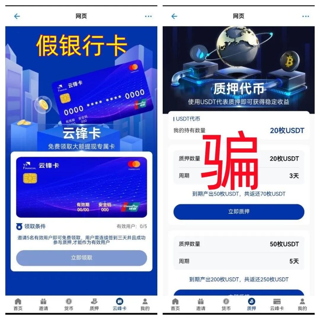 该项目宣传要给注册的参与者发放“云锋卡”作为大额提现的专属卡?香港常用的字体是繁体字,不是简化字!从这看出就是一张假银行卡,“云锋金融”APP中也是简化字?至于质押USDT产生如此高的“收益”?明显就是一串串虚假的数字而已!