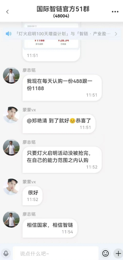 最近,不少人的微信群和朋友圈被一个名为“国际智链”的项目刷屏了。群里气氛热烈,有人天天晒出认购“488元”、“1188元”的截图,高喊着“相信国家,相信智链”,仿佛抓住了财富自由的最后一根稻草。他们宣称这是一个由国务院统筹、国家级机构联合出资的“秘密福利”,只要投资100天就能资产翻倍,每天还能躺着拿收益。
