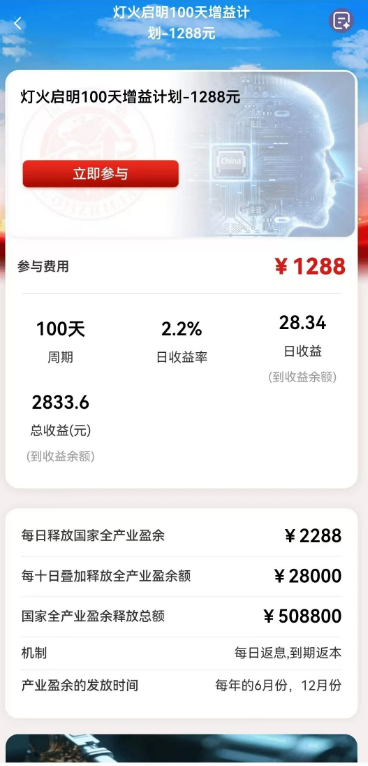 让我们算一笔简单的账。根据群内流传的“产业跃迁通道”规则,投入1288元,日收益2.2%,100天即可拿回2800多元。这意味着年化收益率高达803%。这是什么概念?股神巴菲特的长期年化收益率也不过20%左右,正规银行理财更是只有2%-3%。