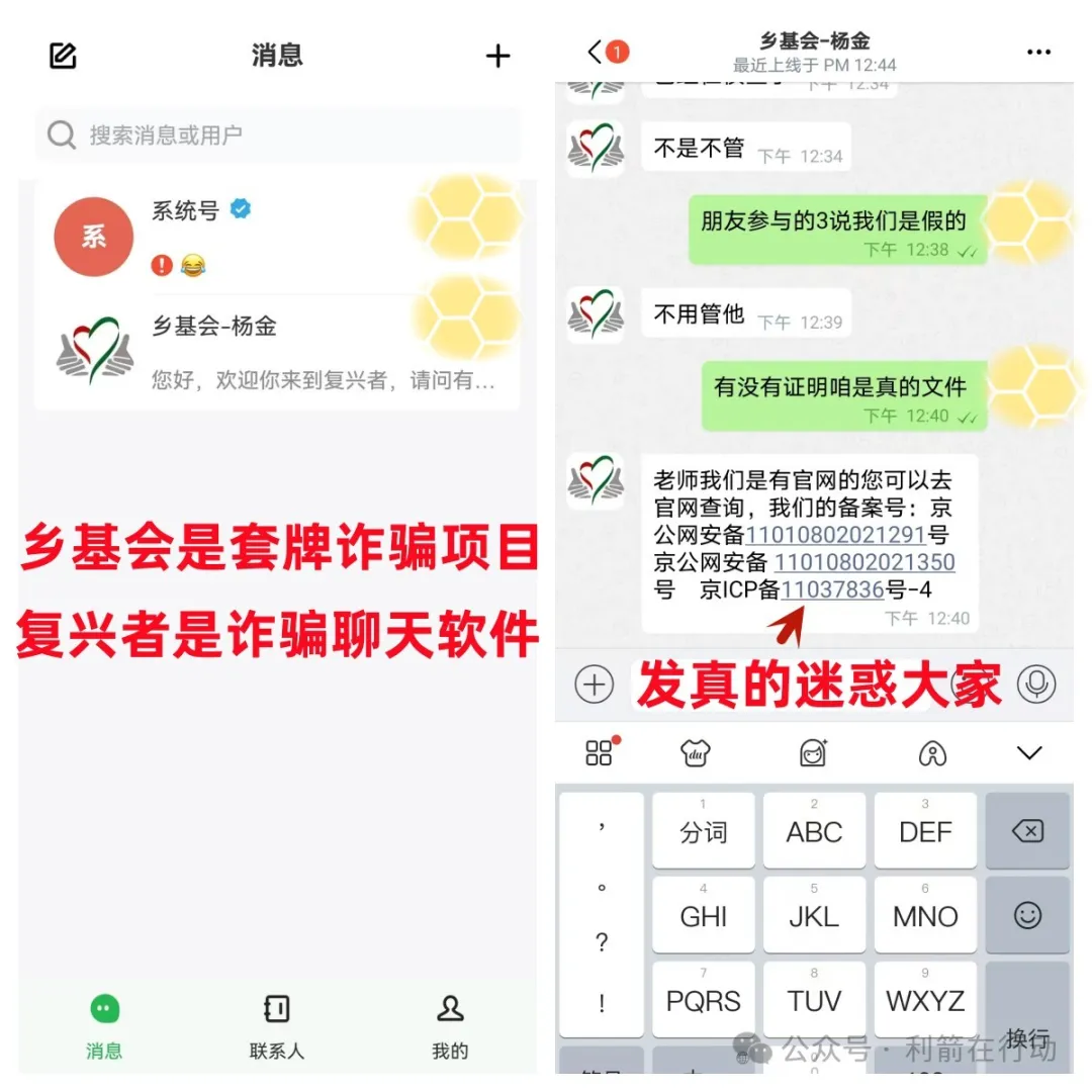 假冒中国乡村发展基金会的“乡基会”APP是诈骗洗钱的“民族资产解冻类”诈骗项目,已经骗了2年了,很多被骗几十万元钱的老人实在太多了,利箭揭露无数次,告诉大家不要上当被骗,然而这个骗局到今天都还在继续诈骗,骗子为了逃避监管,还专门弄了个“复兴者”APP来聊天,宣传“乡基会”项目,骗子为了让人相信,还发了备案号?这是真的!然而与“乡基会”项目是没有关系的,大家赶紧远离吧!