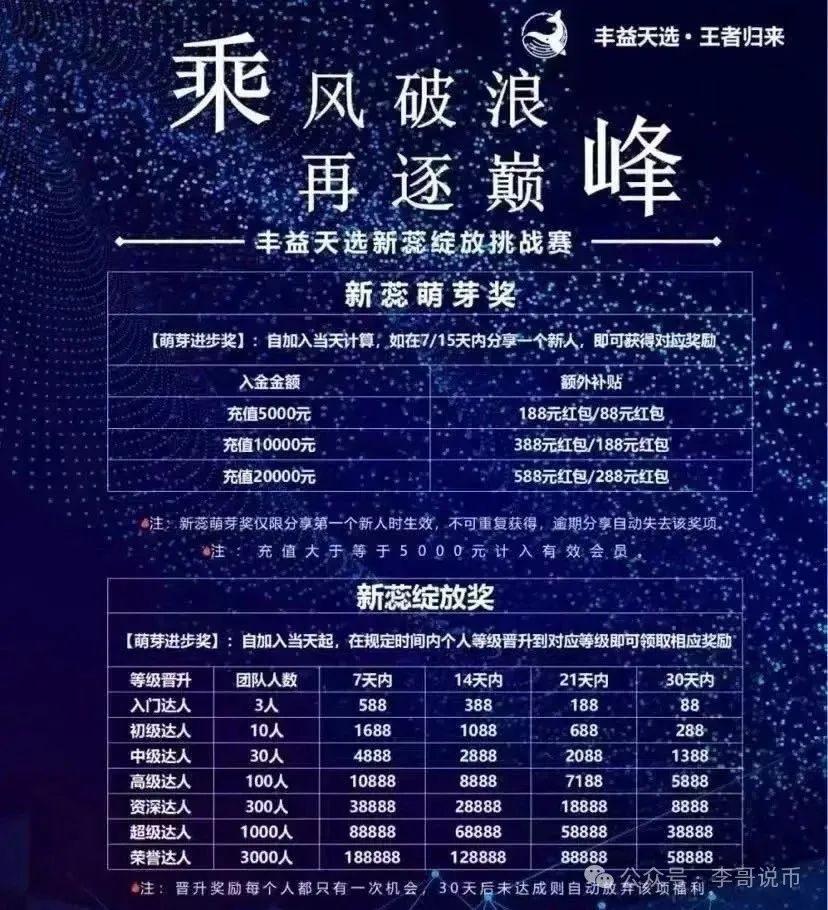 再来看看模式和制度,典型的都是层级分销制度,金字塔顶尖的团队长分后面投资人的游戏,还有些陷入其中玩的不亦乐乎,丰益天选一共分为九个等级入门—至尊,从模式可以看出拉人头,能走上人上顶峰,介绍一个人参与还有额外奖励吗,明眼人一看就知道是骗局。到处打广告,以农产为自己做遮羞布,实则背地里做割韭菜的事,毕竟都是很多操盘手玩够的老套路,主要彰显自己平台,都上了广告毕竟做什么都是合法,这是营销策略,最终盘子跑路,资金池做大,狗庄也就关网跑路了。