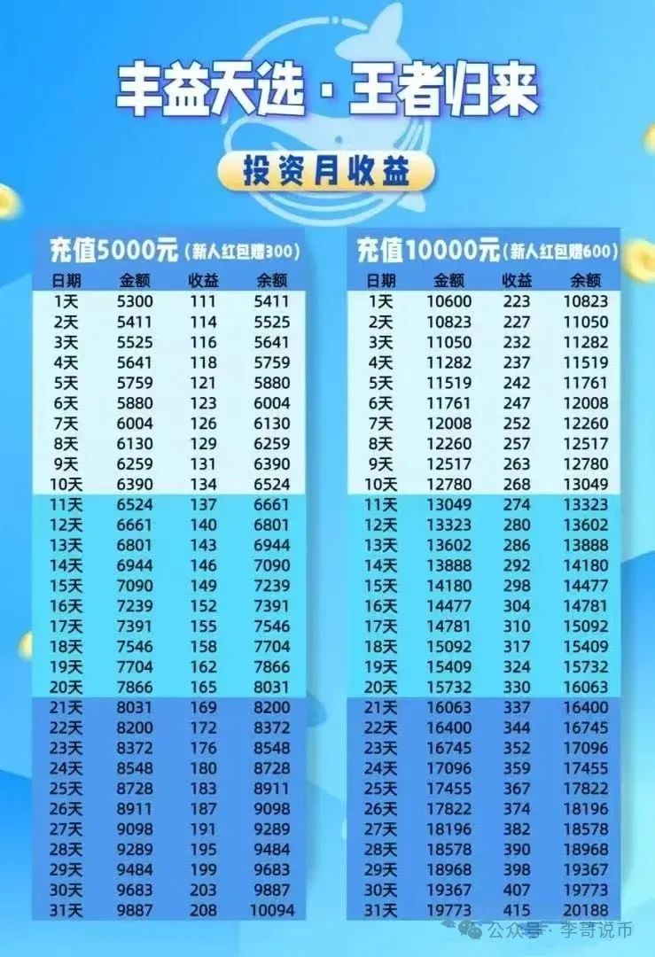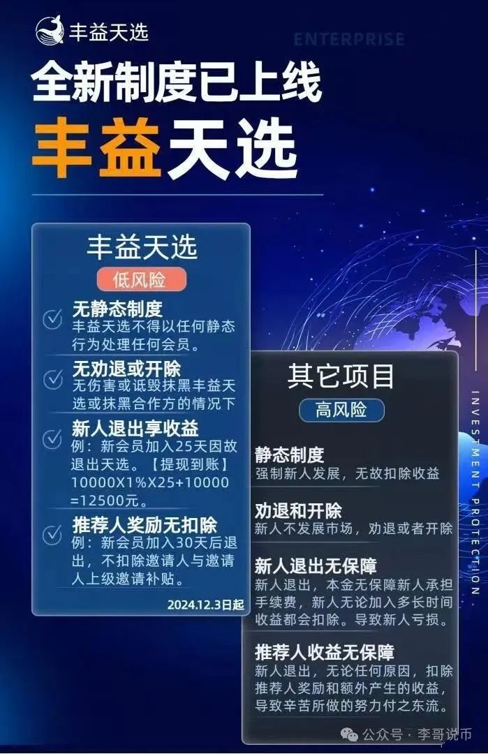 丰益天选日利率都在1%左右,这对商城模式来说高的离谱,丰益天选打着随时可退本金和利息的旗号,比如你投10000十天,说是想退本金随时退!加利息就是11000。可能短时间会给你退,但是泡沫大了,参与的人多了还会给你退吗,更不要想着做团队送无人售货机,无人售货机才几个钱,而且放的位置不好营业额就是零,都醒醒吧!