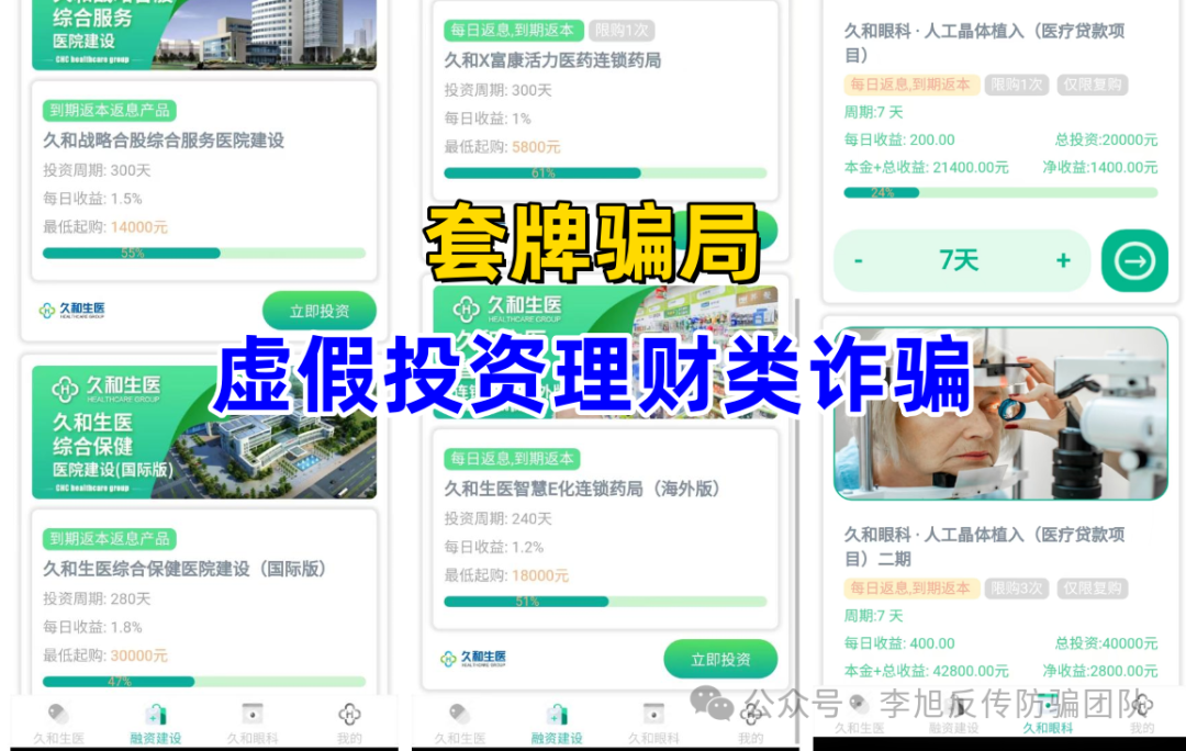 该项目冒充“久和医疗”公司的名义,制作散布涉诈APP,虚构推广“久和眼科·人工晶体植入”“久和眼科·人工晶体植入”等每日返利,到期返本等高额返利理财项目,收取款账户为第三方个人、公司,涉嫌诈骗。
