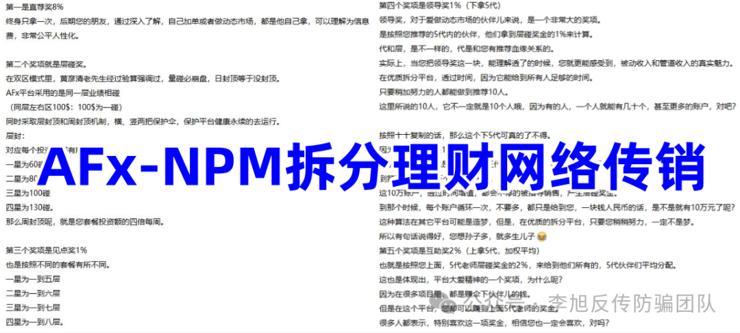 网友反馈,AFx-NPM项目是ACE王牌理财崩盘后,一个分支改名而来,以拆分理财的名义,投资可以获得静态收益,发展下线可以获得直荐奖、层碰奖、见点奖等。