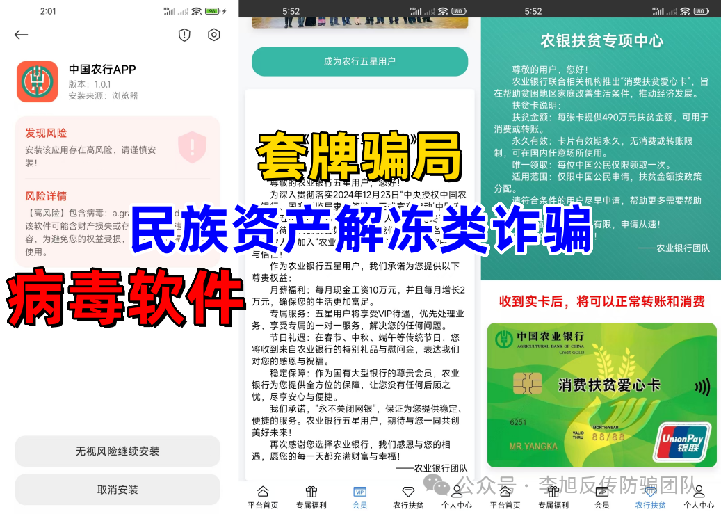 该项目冒充“中国农业银行”的名义,打着慈善扶贫的旗号,制作散布涉诈APP,声称实名注册即可获得490万元的扶贫金,缴纳200元成为五星客户,可以每月领取10万元工资,涉嫌非法搜集个人信息,诈骗。