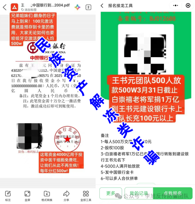 不法分子谎称中华民族历史上各朝代灭亡后以及国民党溃败台湾时在大陆和海外遗留保存了巨大财富,国家现委托一些民间组织或企业对这些海外“民族资产”进行解冻,通过诱骗受害人缴纳启动资金、会员报名费或者投资入股等实施诈骗。